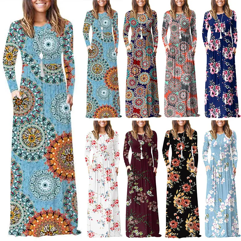 Related Product for women Dresses and Autumn / Winter 2020 Printed Long Sleeve Pocket Dress Round Neck Waist Skirt
